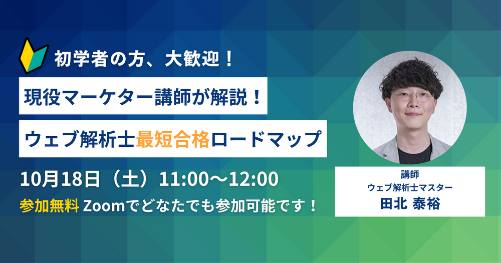 デジタルマーケティングを通して事業の成果を導く専門家「ウェブ解析士」の取得を目指す方のための無料オンラインセミナーです。事業会社と支援会社の両方で活動する現役マーケター講師が、初心者の方にも分かりやすく合格への最短ルートを解説します。