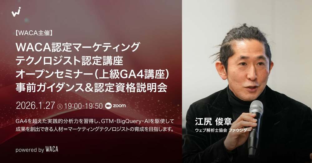 本セミナーは、マーケティングテクノロジスト認定講座【WACA公式】(旧上級GA4講座)の受講を検討されている方や現受講生を対象に、講座の全体像と認定制度の意義を詳しくご紹介するガイダンスイベントです。